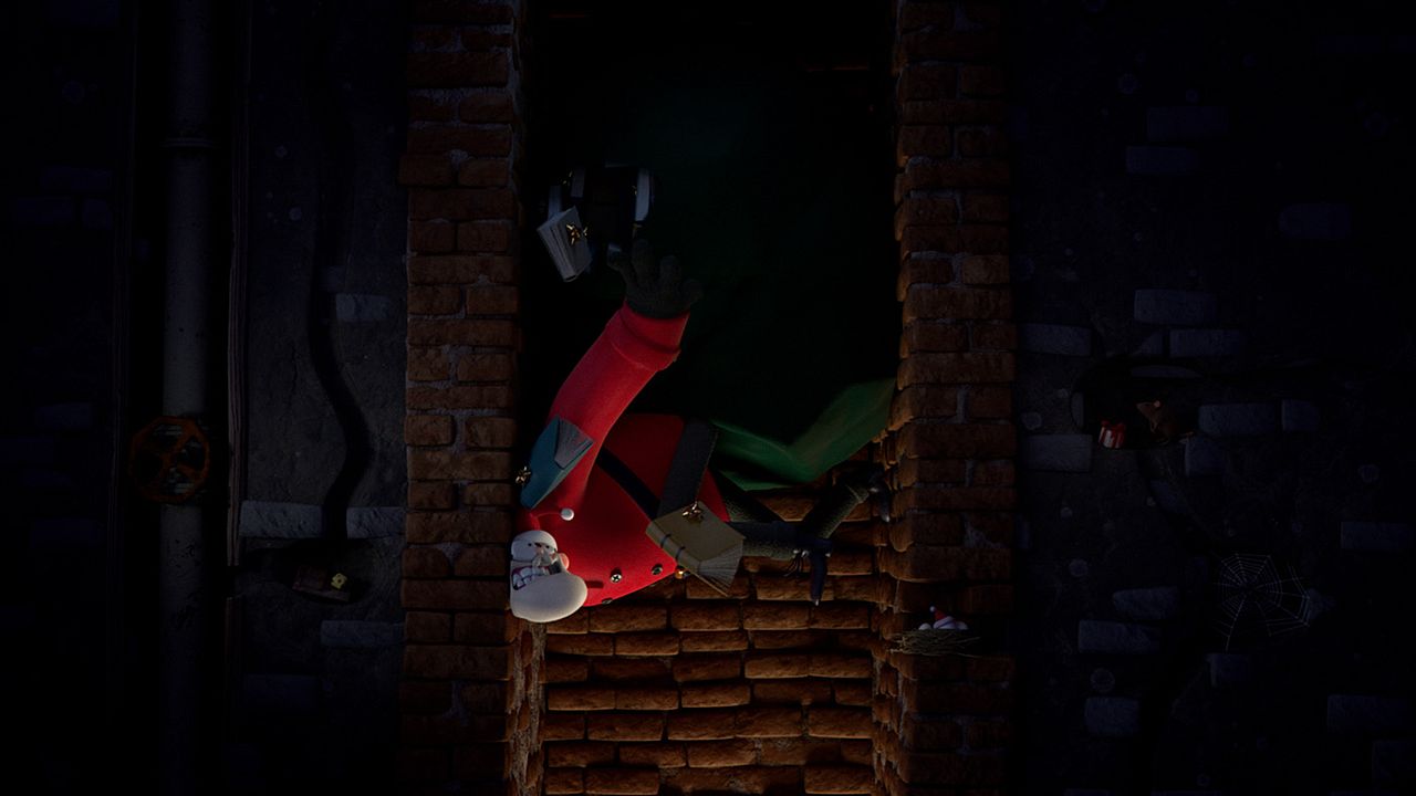 Santa fumbles with wrapped parcels; meanwhile, his elf relaxes with an audiobook. Together they ask: why risk mess when stories are effortless?